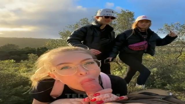 Да как так, даже в лесу невозможно уединиться, везде шастают туристы. Когда девка захотела побаловать парня минетом, то откуда не возьмись, нарисовалась молодая русская парочка. И нет, чтобы молча пройти мимо, они подошли и попросили парня сфоткать их, несмотря на то, что телочка активно сосет и дрочит ему член.